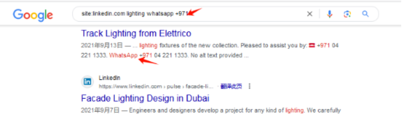 site:linkedin.com lighting whatsapp +971(我们可以换在不同的国别号及社交媒体进行搜索,只要按照这种格式输入我们想要查询的就好),结果很快就会出来。